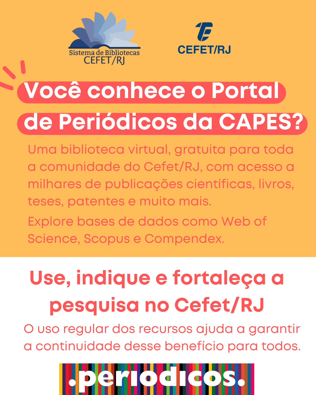 O Portal de Periódicos da CAPES é uma biblioteca virtual, gratuita para toda a comunidade do Cefet/RJ, que reúne e disponibiliza a instituições de ensino e pesquisa no Brasil o melhor da produção científica internacional. Possui um acervo com mais de 48 mil títulos de periódicos, 130 bases referenciais e resumos, 41 bases de dados estatísticas e 64 bases de teses e dissertações e 12 bases de patentes.