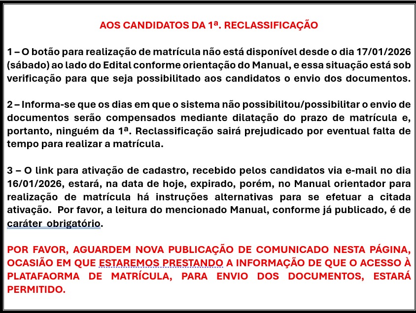 04/01/2026 - O PERÍODO DE MATRÍCULA da 1a. chamada não terá início no dia 05/01/2026 conforme previsto no COMUNICADO nº 04/2025 da Coordenação de Concursos, o qual foi publicado nesta página em 10/12/2025, mas sim em 06/01/2026, a partir das 10h.