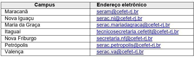 DÚVIDAS DURANTE O PROCEDIMENTO DE MATRÍCULA, encaminhar e-mail conforme o quadro a seguir: