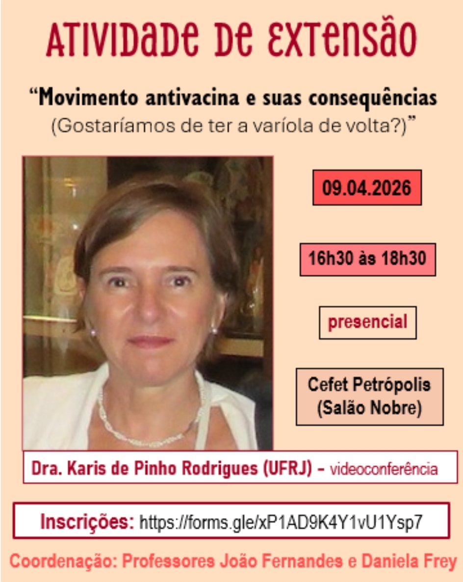 O Cefet/RJ Petrópolis promove na próxima quinta-feira, dia 9 de abril, a palestra "Movimento antivacina e suas consequências (Gostaríamos de ter a varíola de volta?)", com a...
