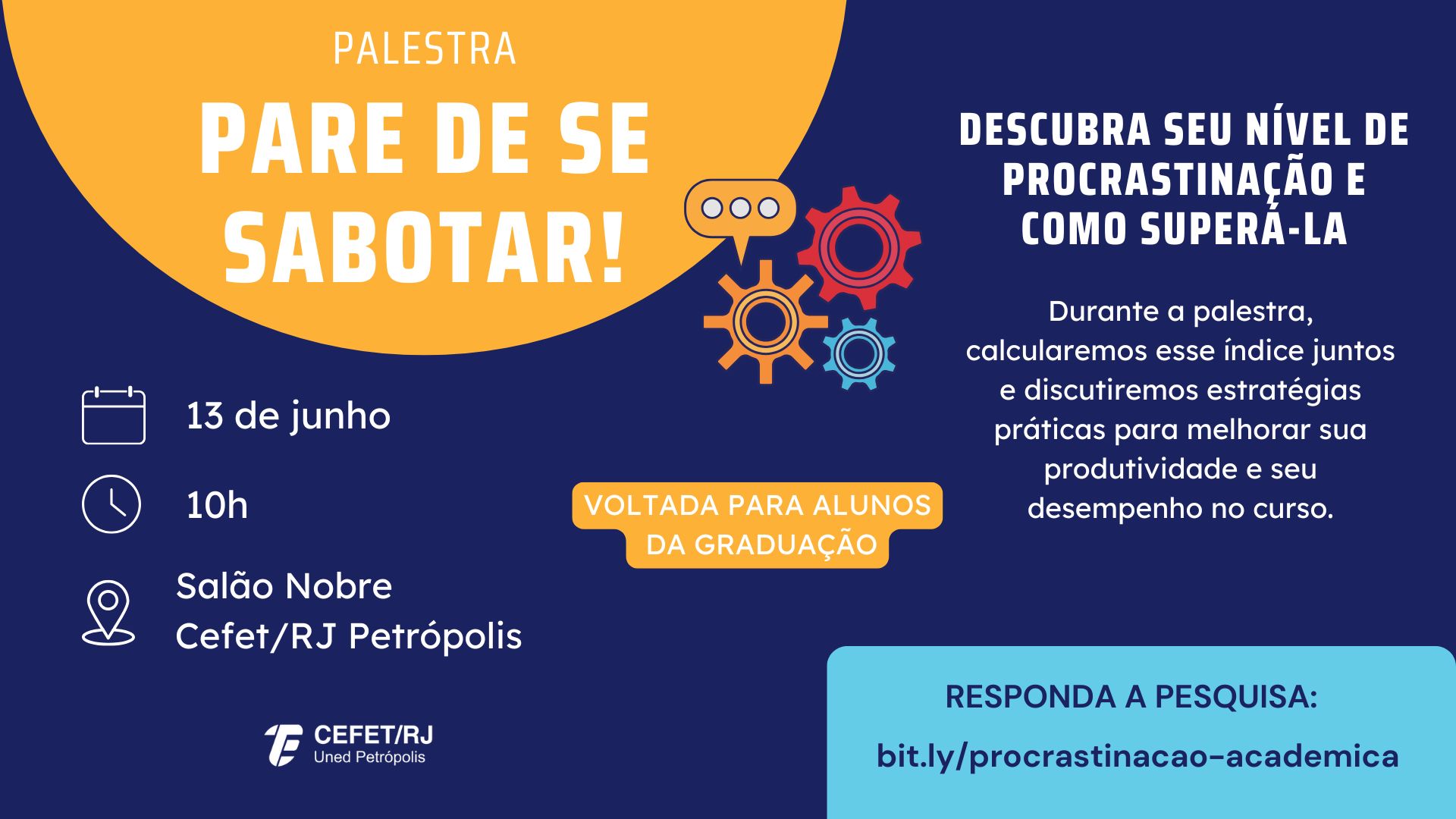 No dia 13 de junho, às 10h, o Salão Nobre do Cefet/RJ Petrópolis recebe a palestra “Pare de se sabotar! Descubra o seu nível de procrastinação e como superá-la”, ministrada pela psicóloga da unidade Nova Iguaçu, Danielle Rodrigues. O evento é voltado, sobretudo, para alunos da graduação.