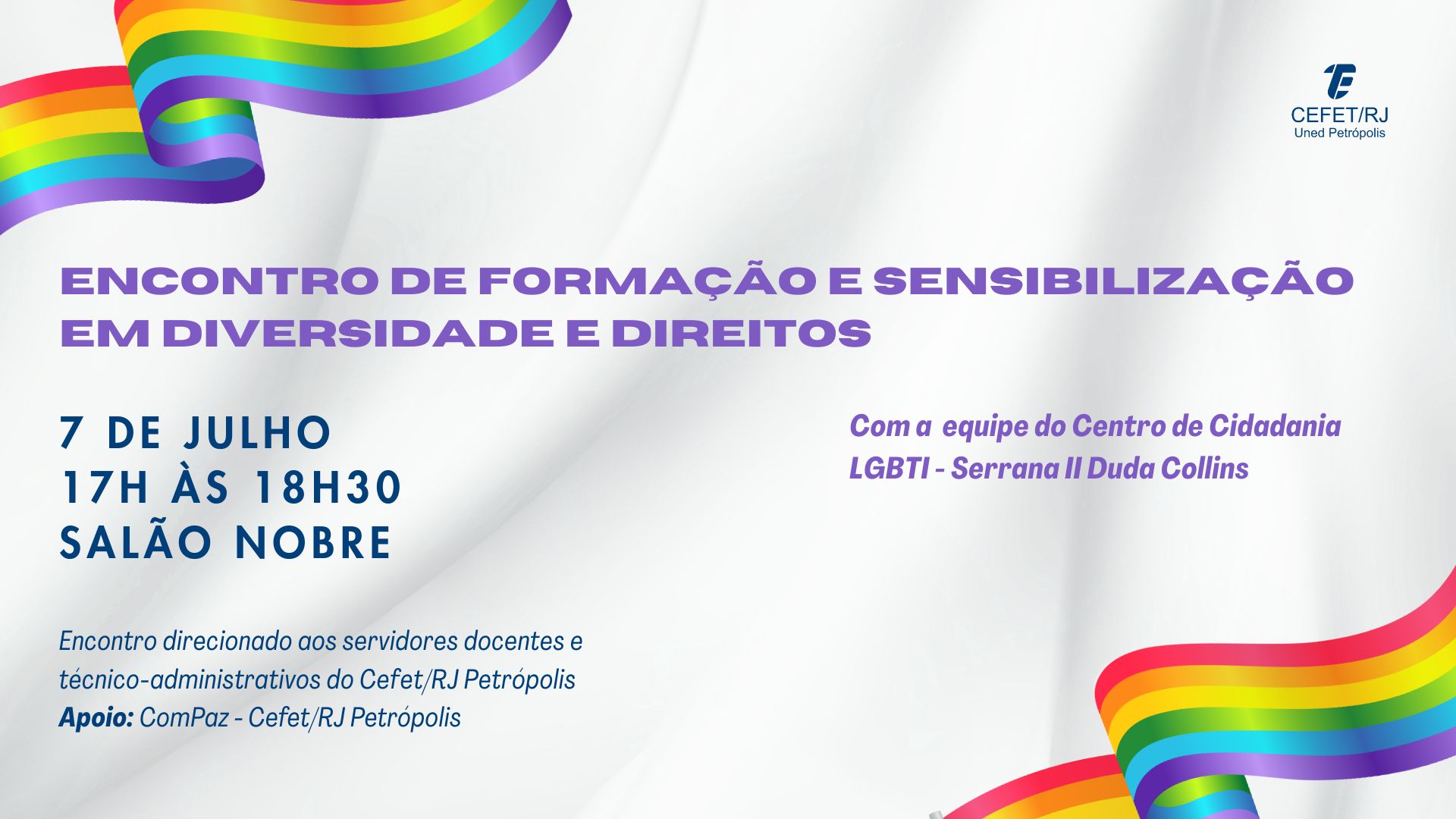 O Cefet/RJ Petrópolis realizará no dia 7 de julho, das 17h às 18h30, o “Encontro de Formação e Sensibilização em Diversidade e Direitos”. A atividade, que será conduzida pela equipe do Centro de Cidadania LGBTI – Serrana II Duda Collins, é voltada exclusivamente para os servidores docentes e técnico-administrativos da unidade.
