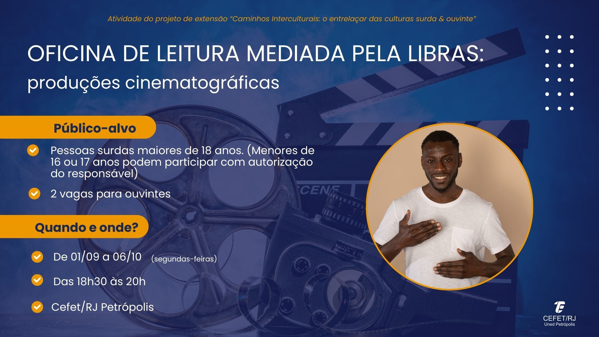 O Cefet/RJ Petrópolis, por meio do projeto de extensão “Caminhos Interculturais: o entrelaçar das culturas surda & ouvinte”, vai realizar a segunda oficina de leitura voltada para pessoas surdas entre 1º de setembro e 6 de outubro. Ao todo, serão seis encontros da “Oficina de leitura mediada pela Libras: produções cinematográficas”, sempre às segundas-feiras, das 18h30 às 20h.