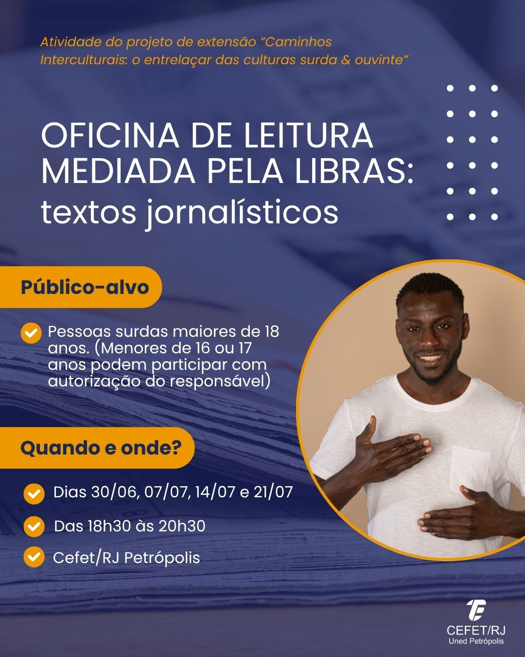 O Cefet/RJ Petrópolis, por meio do projeto de extensão “Caminhos Interculturais: o entrelaçar das culturas surda & ouvinte”, vai ofertar gratuitamente uma oficina de leitura...