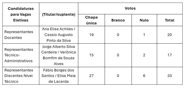 Além disso, divulgamos abaixo os resultados da eleição para representantes do CONPUS-AR, conforme requisitos estabelecidos no edital: