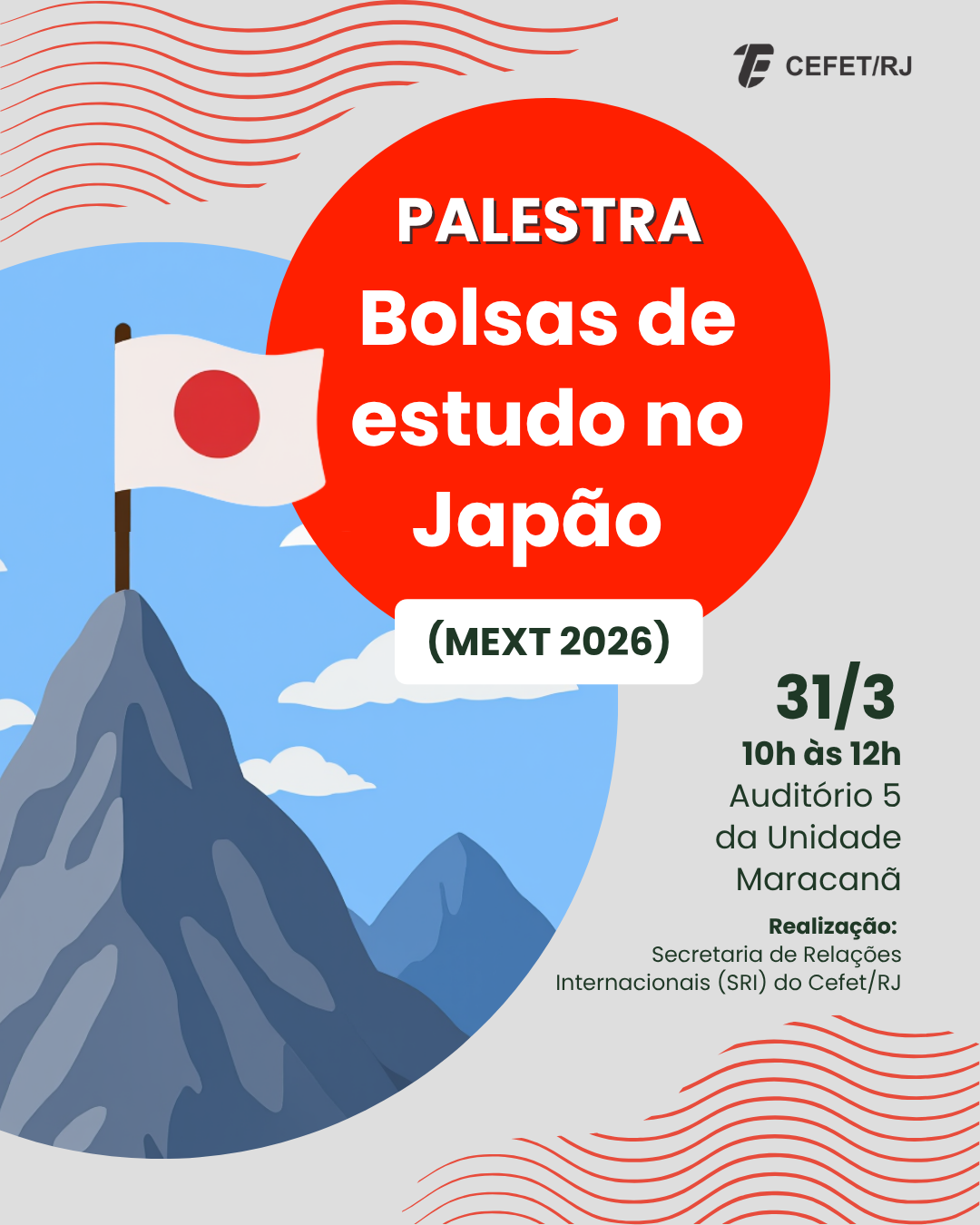 Na próxima terça-feira, 31 de março, a Secretaria de Relações Internacionais (SRI) do Cefet/RJ vai promover uma palestra voltada a estudantes interessados em bolsas de estudo no Japão oferecidas pelo Ministério da Educação, Cultura, Desporto, Ciência e Tecnologia (MEXT 2026).