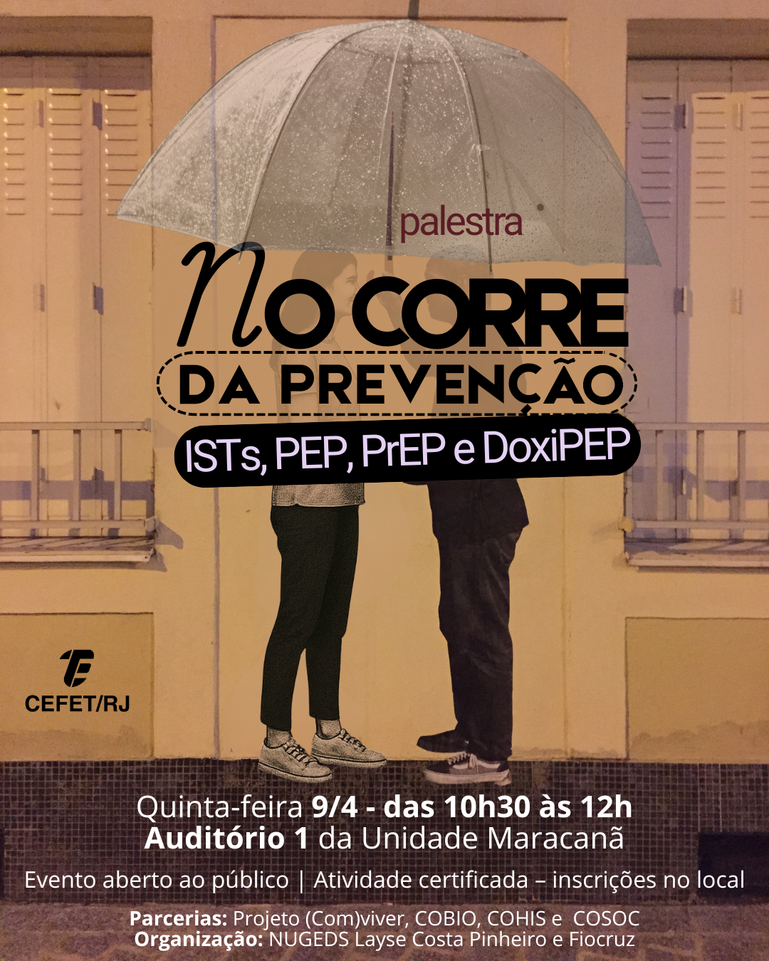 Na quinta-feira (9), o Auditório 1 da Unidade Maracanã receberá a palestra “No corre da prevenção – ISTs, PEP, PrEP e DoxiPEP”, com Débora Castanheira, pesquisadora da Fiocruz. A atividade acontecerá das 10h30 às 12h e é aberta ao público. Os participantes poderão obter certificado mediante inscrição no local. A palestra é organizada pelo Núcleo de Gênero e Diversidade Sexual (NUGEDS) da unidade, em parceria com a Fiocruz.