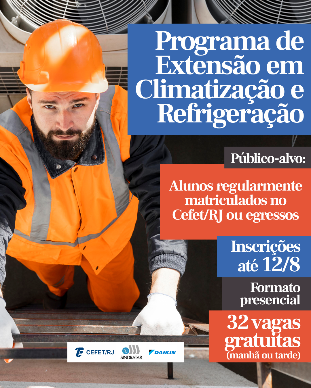 Os alunos regularmente matriculados no Cefet/RJ ou egressos da instituição poderão se inscrever, até o dia 12 de agosto, na 4ª turma do curso de Climatização e Refrigeração. O programa de extensão é realizado em parceria com o Sindicato da Indústria de Refrigeração, Aquecimento e Tratamento de Ar do Estado do Rio de Janeiro (Sindratar-RJ), com patrocínio da Daikin Brasil.