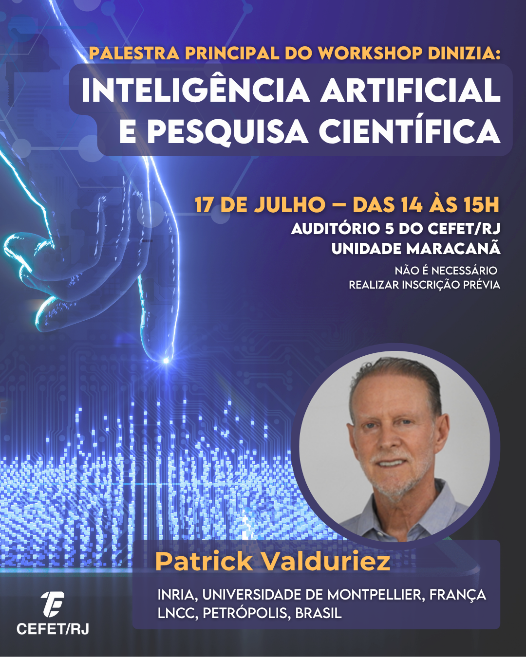 Na próxima quinta-feira, dia 17 de julho, o Cefet/RJ vai receber o palestrante Patrick Valduriez, professor do Instituto Nacional de Pesquisa em Ciências e Tecnologias Numéricas (Inria), da Universidade de Montpellier, na França, e pesquisador do Laboratório Nacional de Computação Científica (LNCC), em Petrópolis/RJ. A apresentação será em inglês, no Auditório 5 da , das 14h às 15h, e vai abordar a inteligência artificial (IA) e a pesquisa científica.