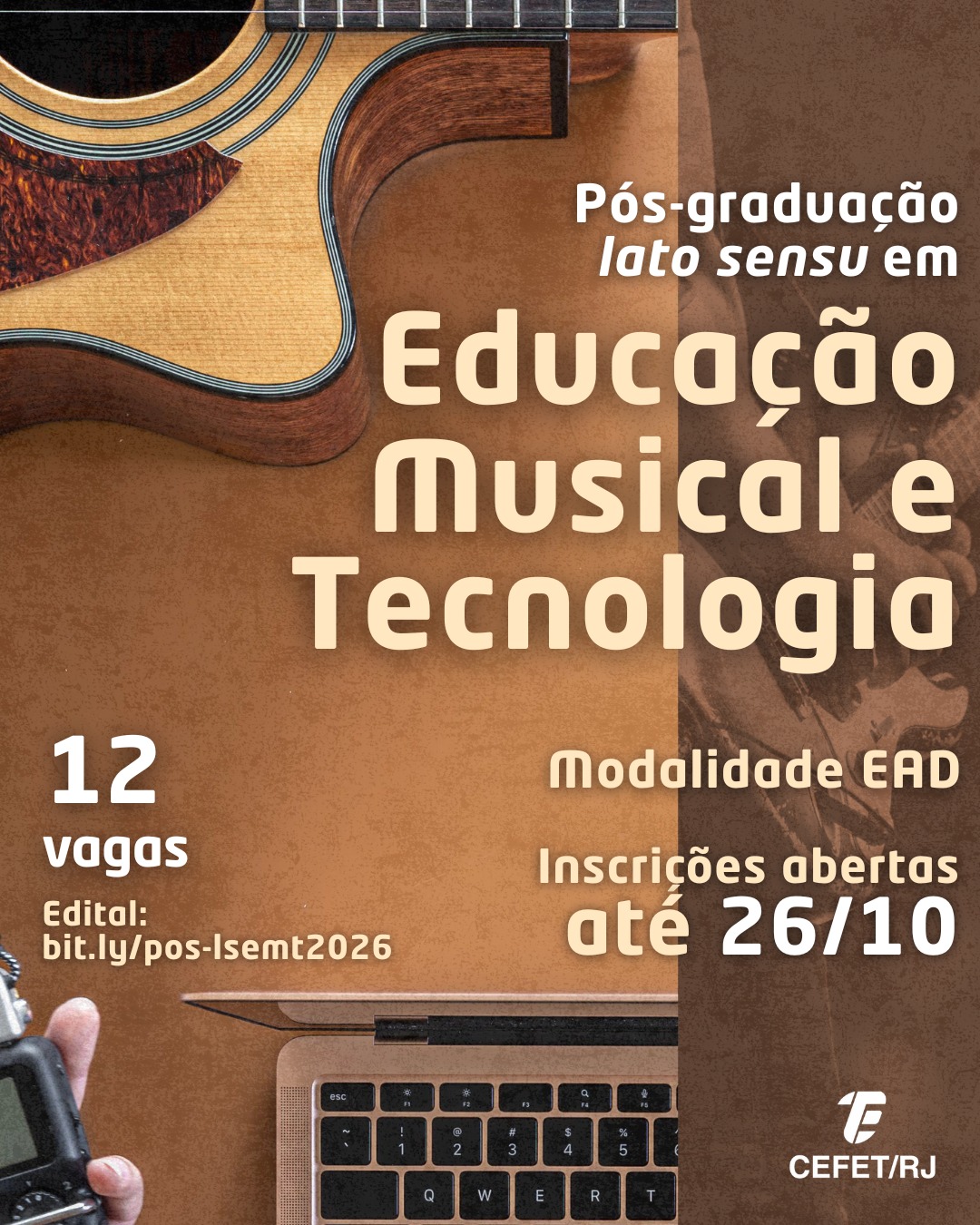 O Cefet/RJ disponibilizou para consulta o edital relativo à segunda turma da pós-graduação lato sensu em Educação Musical e Tecnologia, na modalidade educação a distância (EAD). O processo seletivo abre 12 vagas para pessoas com curso superior completo em qualquer área do conhecimento, preferencialmente em licenciatura em Música, Dança, Teatro, Artes Visuais ou bacharelado nas diversas linguagens artísticas. Metade das oportunidades é reservada a pessoas negras, indígenas e quilombolas e outras duas vagas a pessoas com deficiência. A pós-graduação terá duração de 12 meses e será ofertada pela Unidade Maracanã.