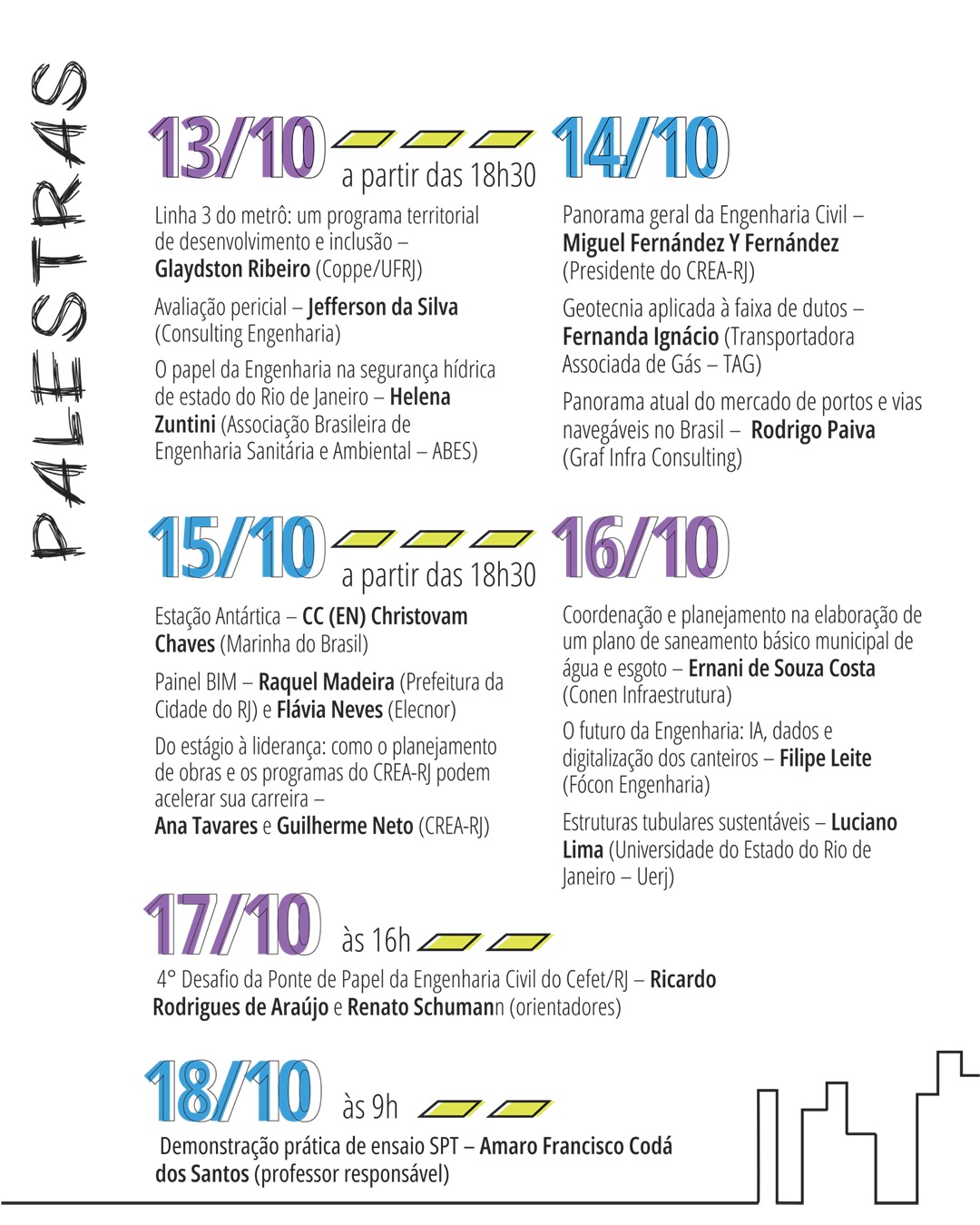 A Unidade Maracanã sediará a V Semana de Engenharia Civil do Cefet/RJ, que ocorrerá de 13 a 18 de outubro. Nos quatro primeiros dias, de 13 a 16/10, a partir das 18h30, haverá palestras sobre temas diversos como mercado de portos e vias navegáveis no Brasil, avaliação pericial, utilização de modelos digitais inteligentes, estágio e carreira, Estação Antártica, plano de saneamento básico, futuro da Engenharia, entre outros. No dia 17, acontecerá o desafio de pontes de papel e, no dia 18 (sábado), uma demonstração prática de sondagem SPT (Standard Penetration Test), que analisa a capacidade de carga e a resistência do solo, cruciais para a segurança e a estabilidade de edificações e obras de infraestrutura.