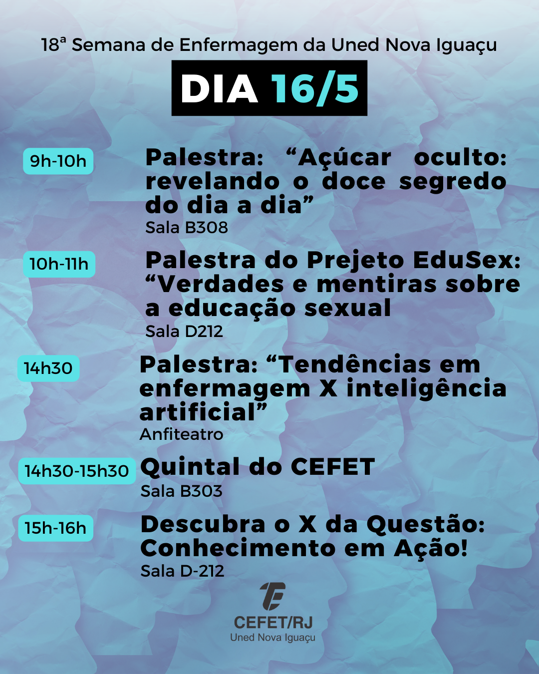 O Cefet/RJ Uned Nova Iguaçu realizará, nos dias 15 e 16 de maio, a 18ª Semana de Enfermagem, que abordará o tema “Saúde planetária: desafios e a atuação crítica da Enfermagem”, proposto pela 84ª Semana Brasileira de Enfermagem (SBEn). A programação começa às 8h e vai até as 17h e contará com apresentações de projetos de docentes e discentes, mesas-redondas e participação de profissionais convidados, com o intuito de instigar reflexões sobre as práticas e os impactos da enfermagem no cenário global da saúde.