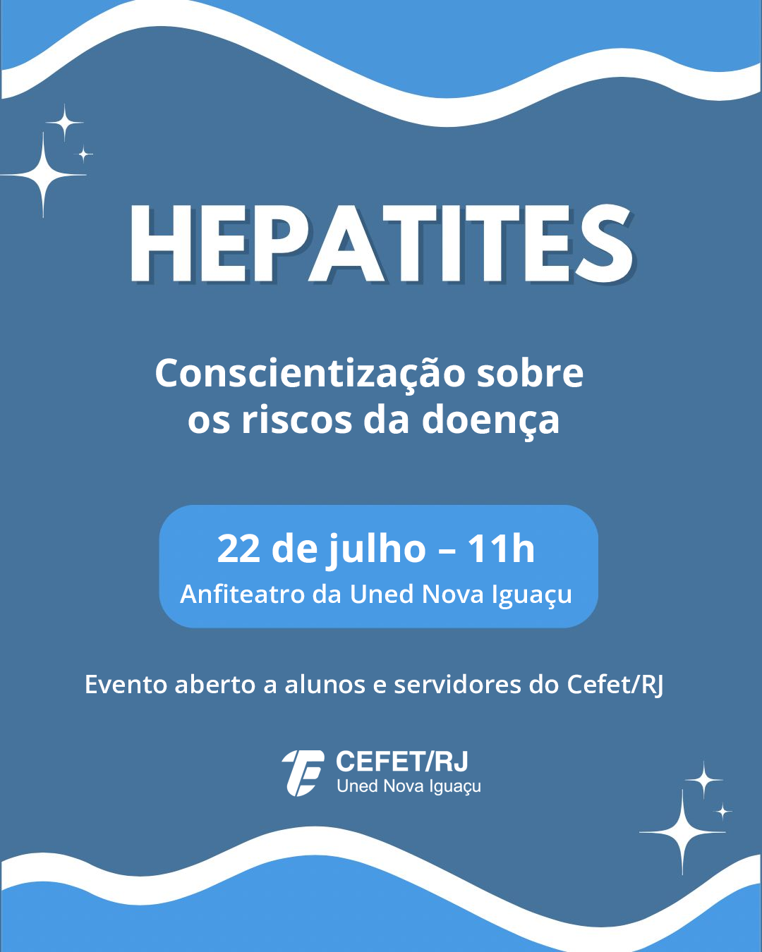 No dia 22 de julho, o projeto de extensão CuidaCEFET, da Uned Nova Iguaçu, vai realizar um evento para conscientizar as pessoas sobre os riscos das hepatites. A atividade contará com debate, dinâmicas interativas e aferição de pressão arterial e glicemia capilar. O evento será aberto a alunos e servidores e acontecerá no Anfiteatro da unidade, às 11h. Não é necessário realizar inscrição.