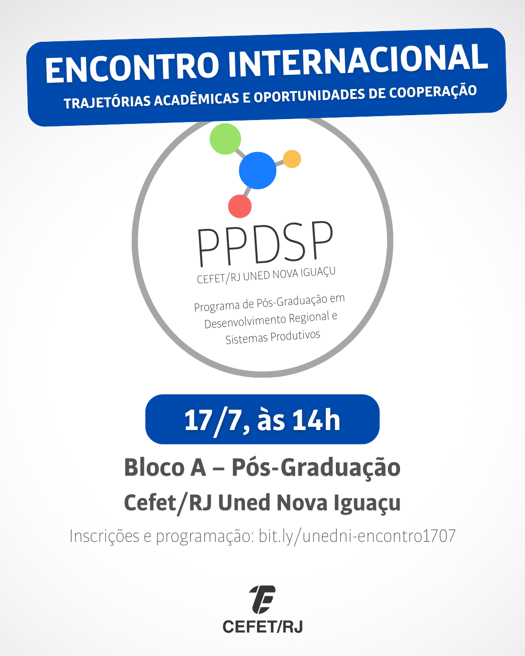 Na próxima quinta-feira (17), o Programa de Pós-Graduação em Desenvolvimento Regional e Sistemas Produtivos (PPDSP), da Uned Nova Iguaçu, vai realizar o evento “Encontro internacional: trajetórias acadêmicas e oportunidades de cooperação”. A atividade acontecerá no Bloco A, às 14h (credenciamento a partir das 13h30), e é aberta à comunidade acadêmica e ao público externo. O objetivo da iniciativa é promover um diálogo sobre internacionalização, redes de pesquisa e colaboração científica. Acesse o formulário de inscrições e a programação pelo link bit.ly/unedni-encontro1707.