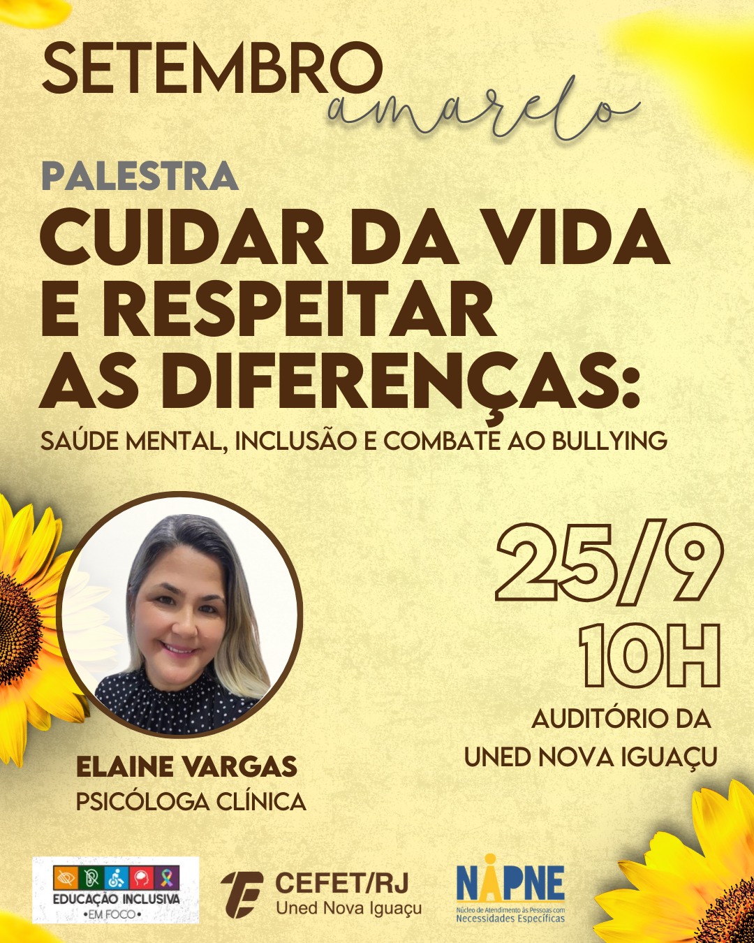 O projeto de extensão “Educação inclusiva em foco”, da Uned Nova Iguaçu, vai realizar a palestra “Cuidar da vida e respeitar as diferenças: saúde mental, inclusão e combate ao bullying”. O evento acontecerá nesta quinta-feira (25), às 10h, no Auditório da unidade, e será conduzido pela psicóloga clínica Elaine Vargas. A atividade tem o apoio do Núcleo de Atendimento às Pessoas com Necessidades Específicas (NAPNE).