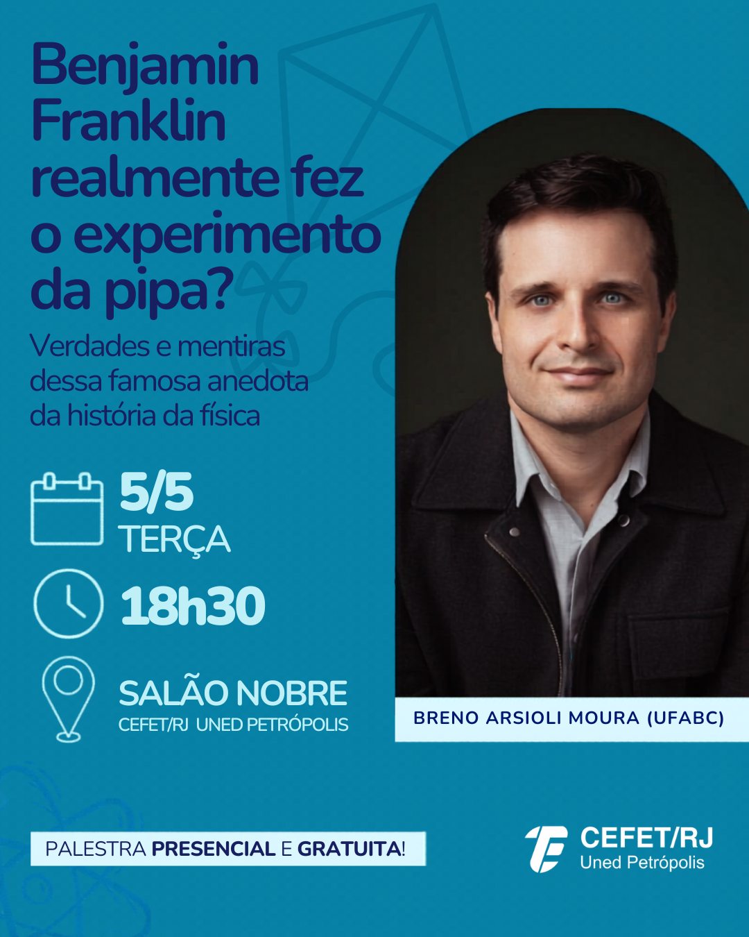 O Cefet/RJ Uned Petrópolis recebe, na próxima terça-feira (5), o professor e pesquisador Breno Arsioli Moura, que ministrará a palestra “Benjamin Franklin realmente fez o experimento da pipa? Verdades e mentiras dessa famosa anedota da história da física”. Gratuito e aberto ao público, o evento será realizado às 18h30, no Salão Nobre da unidade.