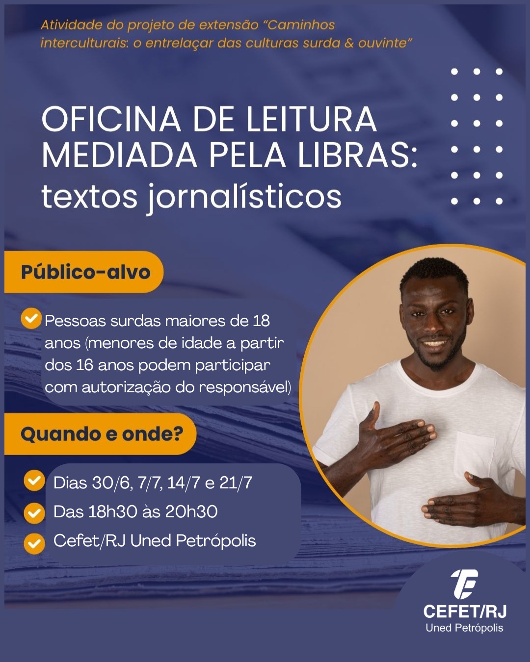 A “Oficina de leitura mediada pela Libras: textos jornalísticos” busca promover a ampliação da inclusão mútua por meio do bilinguismo Libras-português escrito. A atividade é aberta a pessoas surdas a partir dos 18 anos ou aos menores de idade a partir dos 16 anos com autorização dos pais ou responsáveis.