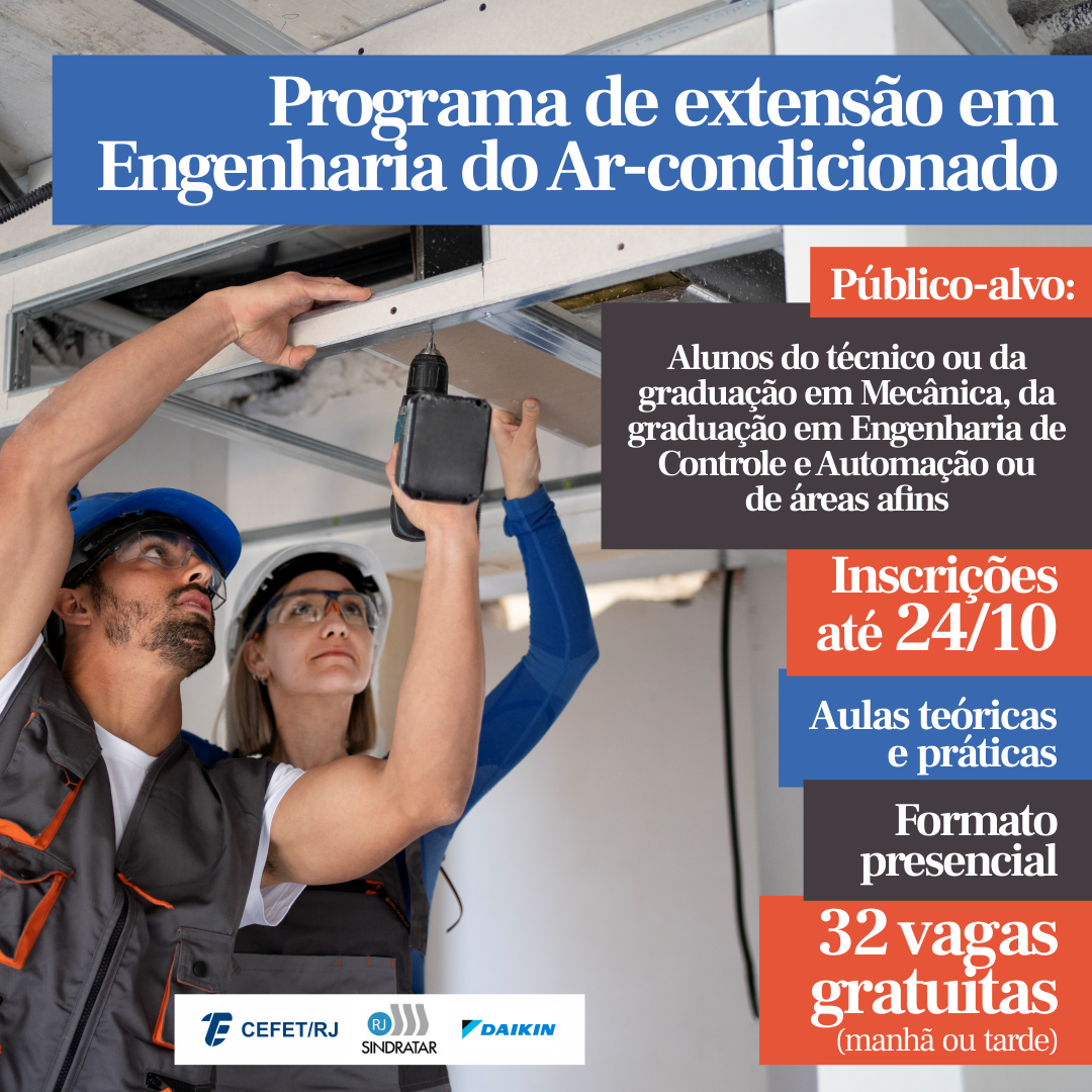 O Cefet/RJ está com seleção aberta para a segunda turma do programa de extensão em Engenharia do Ar-Condicionado, realizado em parceria com o Sindicato da Indústria de Refrigeração, Aquecimento e Tratamento do Ar do Estado do Rio de Janeiro (SINDRATAR-RJ) e apoio da empresa Daikin Brasil. O treinamento tem foco na área de refrigeração e climatização e os interessados podem se inscrever até o dia 24 de outubro.