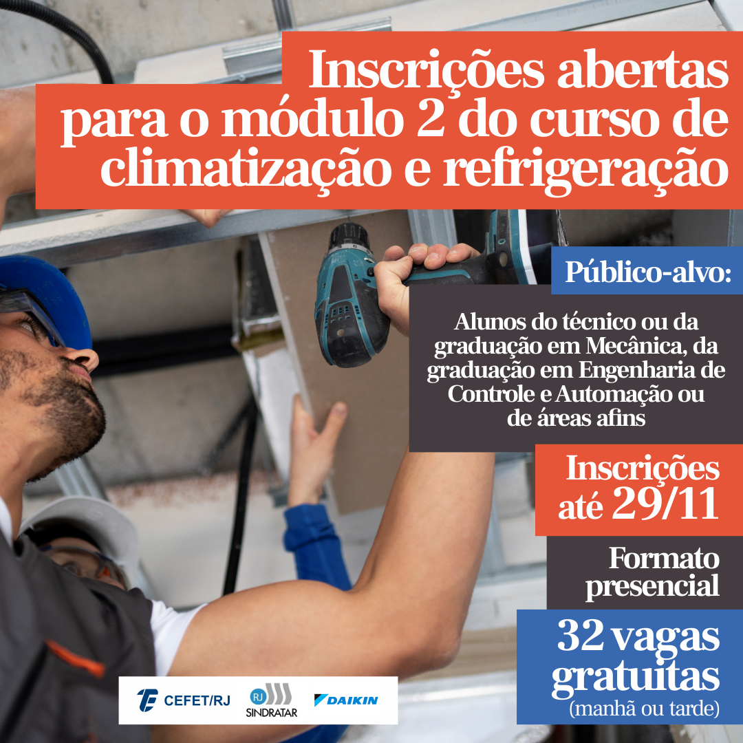O Cefet/RJ está com seleção aberta para a o módulo 2 do programa de extensão em Engenharia do Ar-Condicionado, realizado em parceria com o Sindicato da Indústria de Refrigeração, Aquecimento e Tratamento do Ar do Estado do Rio de Janeiro (SINDRATAR-RJ) e apoio da empresa Daikin Brasil. Este segundo módulo será um complemento ao anterior e vai contemplar as práticas e diagnósticos de falhas. O treinamento tem foco na área de refrigeração e climatização e os interessados podem se inscrever até o dia 29 de novembro.