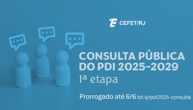 A Diretoria de Gestão Estratégica (DIGES) do Cefet/RJ informa que o processo de consulta pública do Plano de Desenvolvimento Institucional (PDI) 2025-2029 foi prorrogado até o dia 6 de junho.