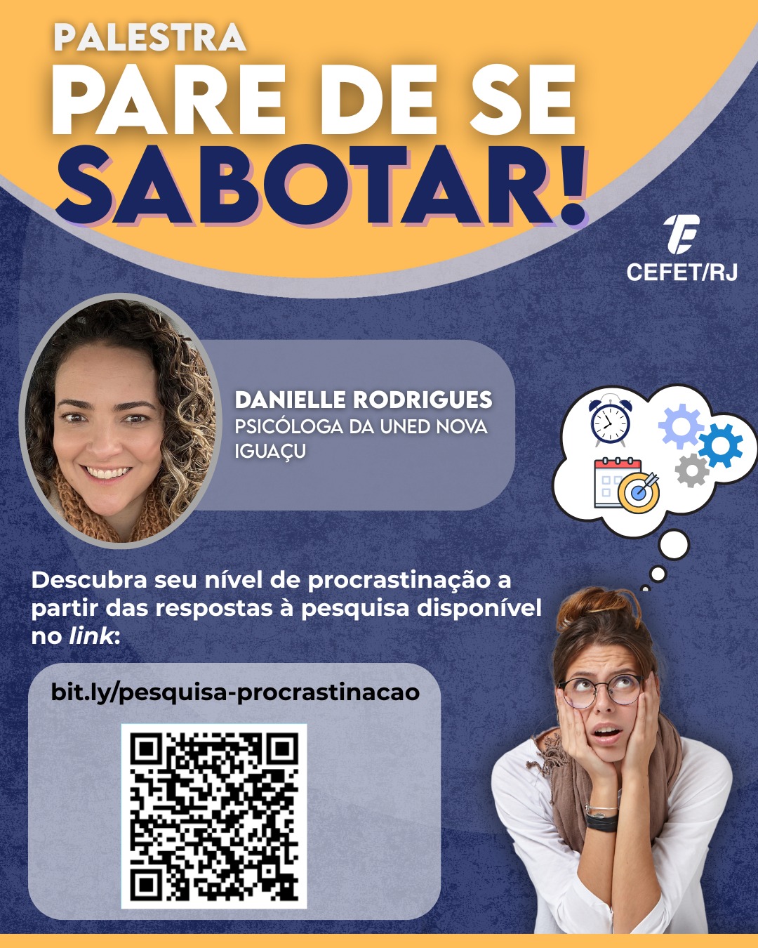 Com o objetivo de abordar a desmotivação e outras dificuldades que comprometem o desempenho acadêmico, o Cefet/RJ promove a palestra interativa “Pare de se sabotar”, ministrada pela psicóloga Danielle Rezende Rodrigues. O evento é direcionado à comunidade acadêmica e acontecerá em várias unidades da instituição, entre os dias 3 e 13 de junho. Os participantes terão direito a certificado. Não é necessário realizar inscrição.