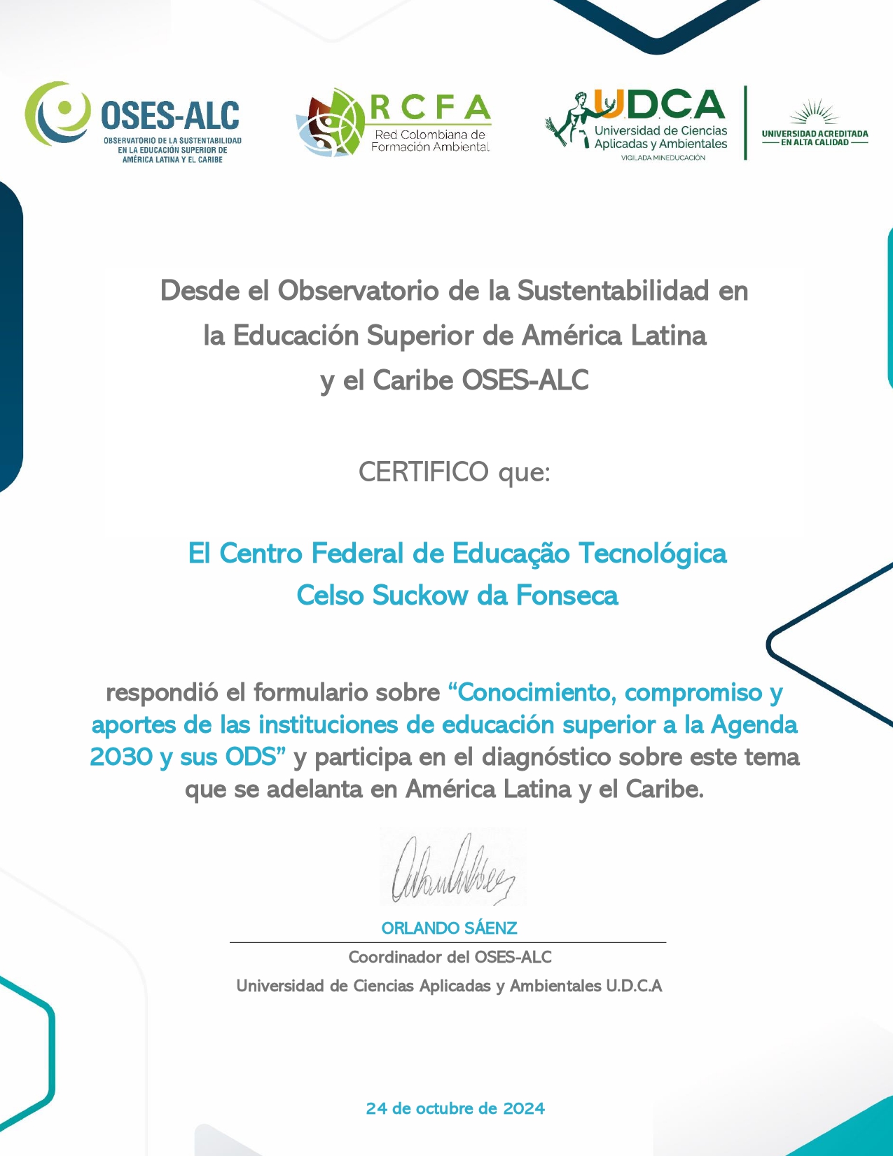 O Observatório de Sustentabilidade e Educação Superior da América Latina e Caribe (OSES-ALC) certificou o Centro Federal de Educação Tecnológica Celso Suckow da Fonseca (CEFET/RJ) por demonstrar seu compromisso com os Objetivos de Desenvolvimento Sustentável (ODS), ao responder o formulário sobre o CONHECIMENTO, COMPROMISSO E CONTRIBUIÇÕES DAS INSTITUIÇÕES DE ENSINO SUPERIOR PARA A AGENDA 2030 OS OBJETIVOS DE DESENVOLVIMENTO SUSTENTÁVEL (ODS) e participar do diagnóstico sobre este tema que é tratado na América Latina e Caribe.