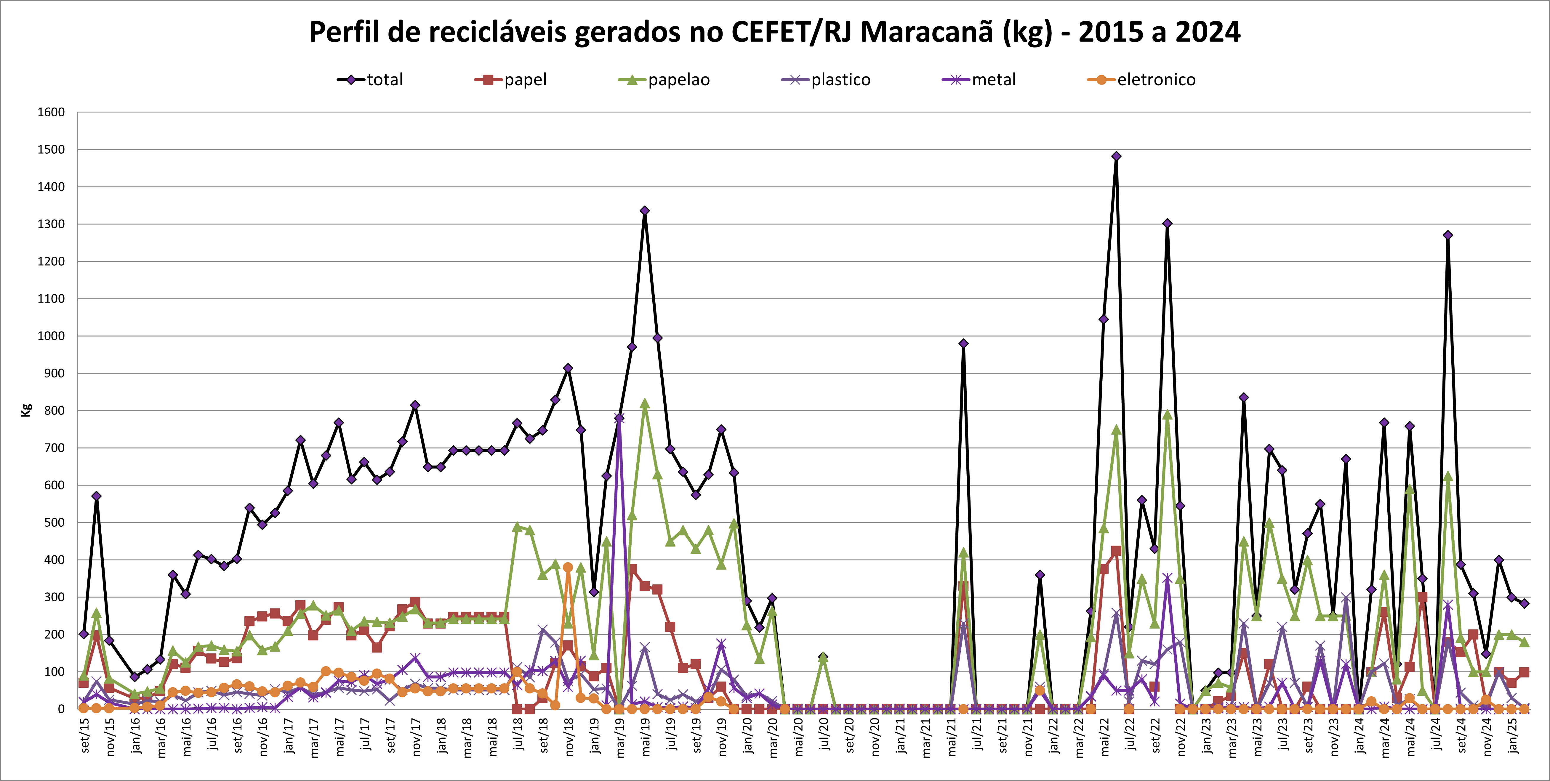 Em termos percentuais, verifica-se a maior participação do papelão e papel em relação aos demais recicláveis (Figura 7) que são gerados no campus Maracanã do Cefet/RJ e destinados às cooperativas, durante o período de 2015 a 2024.