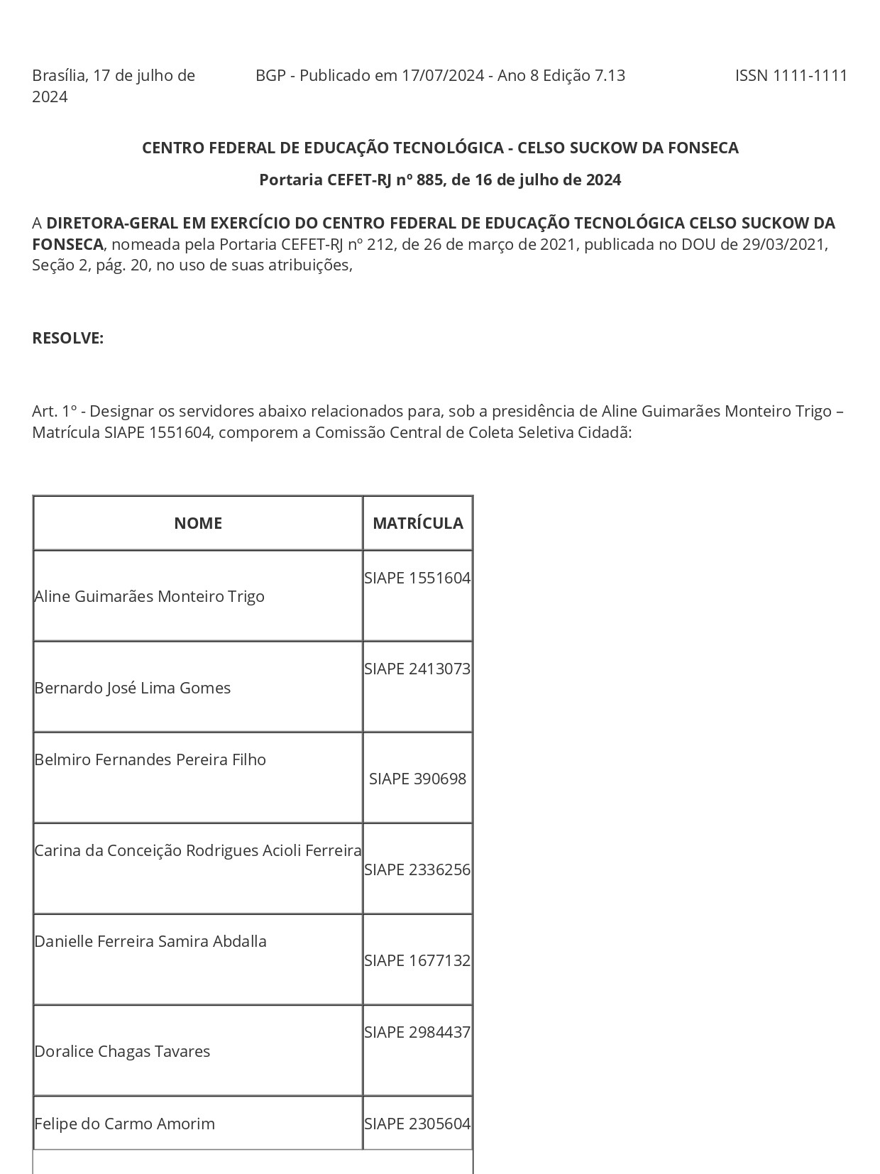 A Portaria mais nova, reeditada, é a 885, de 16 de Julho de 2024 (Figura 2), designando os servidores que compõem a COMISSÃO CENTRAL DE COLETA SELETIVA CIDADÃ (CCCSS) do campus Maracanã. Essa comissão tem como uma das suas funções elaborar editais de chamamento público para seleção de cooperativas/ associações de catadores de materiais recicláveis e reaproveitáveis.