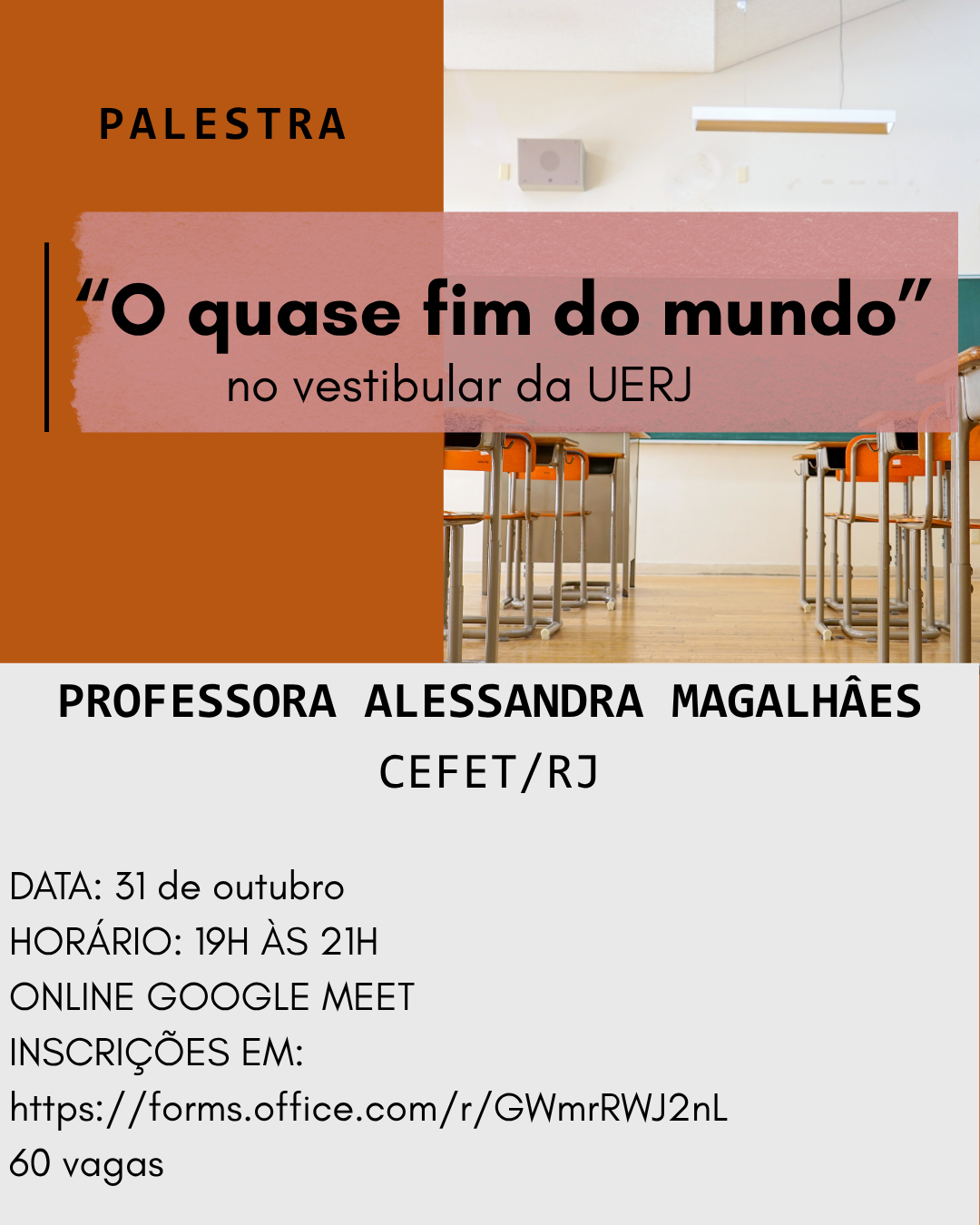 Palestra "O quase fim do mundo" no vestibular da UERJ Ministrada pela Professora Alessandra Magalhães Data: 31 de outubro Horário: 19h às 21h Online pelo Google...