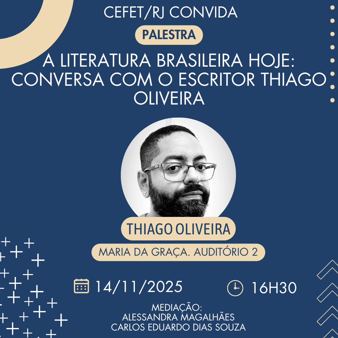 Palestra "A Literatura Brasileira hoje: conversa com o escritor Thiago Oliveira" Mediação: Alessandra Magalhães e Carlos Eduardo Dias Souza Data: 14 de novembro Horário:...