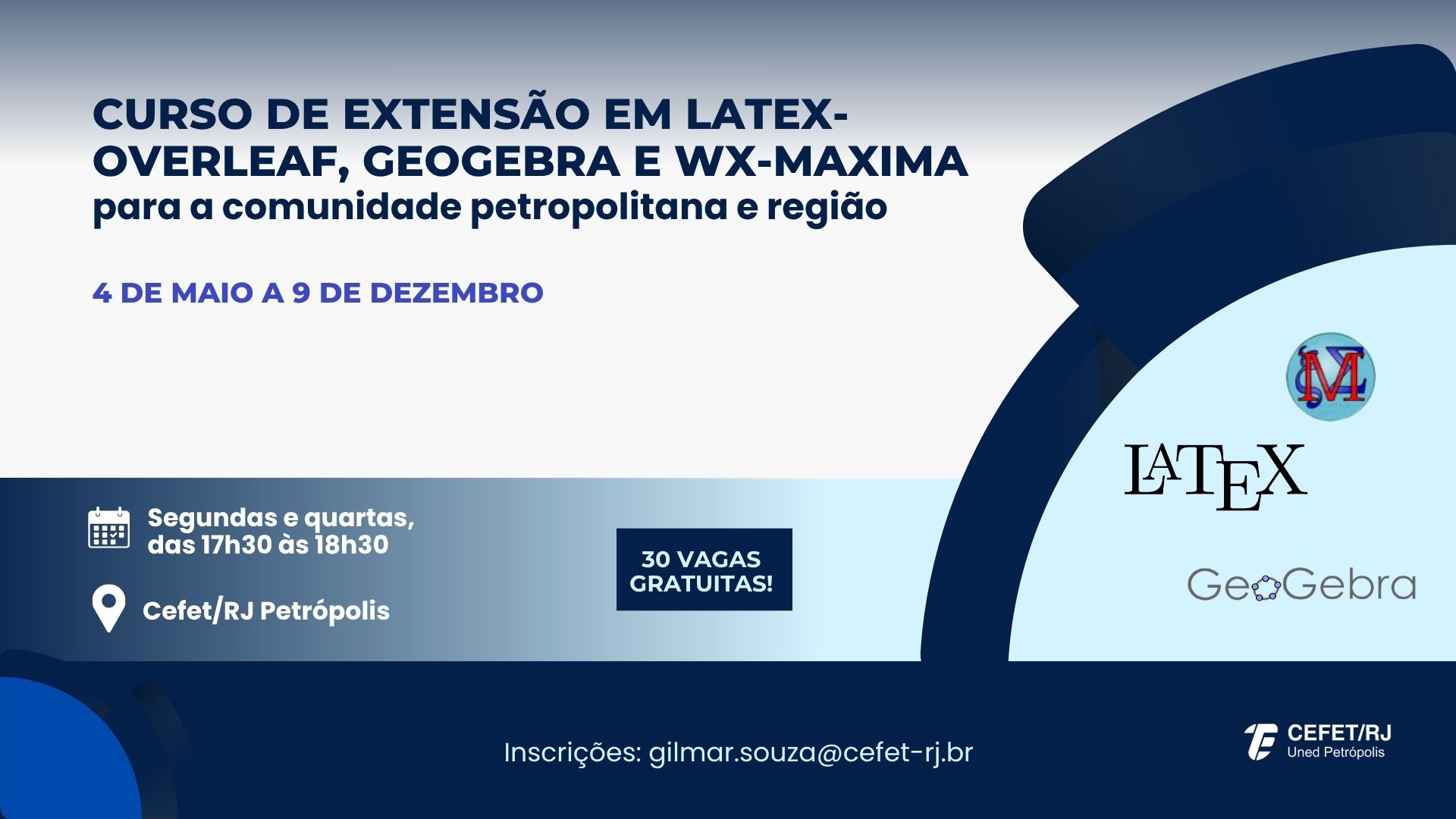 O Cefet/RJ Petrópolis está com inscrições abertas para o “Curso de Extensão em LaTeX-Overleaf, Geogebra e wx-Maxima para a comunidade petropolitana e região”, que terá início no dia 4 de maio. As aulas serão realizadas nos laboratórios de TI da unidade, até dezembro de 2026, sob a coordenação do professor Gilmar Souza. Os encontros acontecerão às segundas e quartas-feiras, das 17h30 às 18h30.