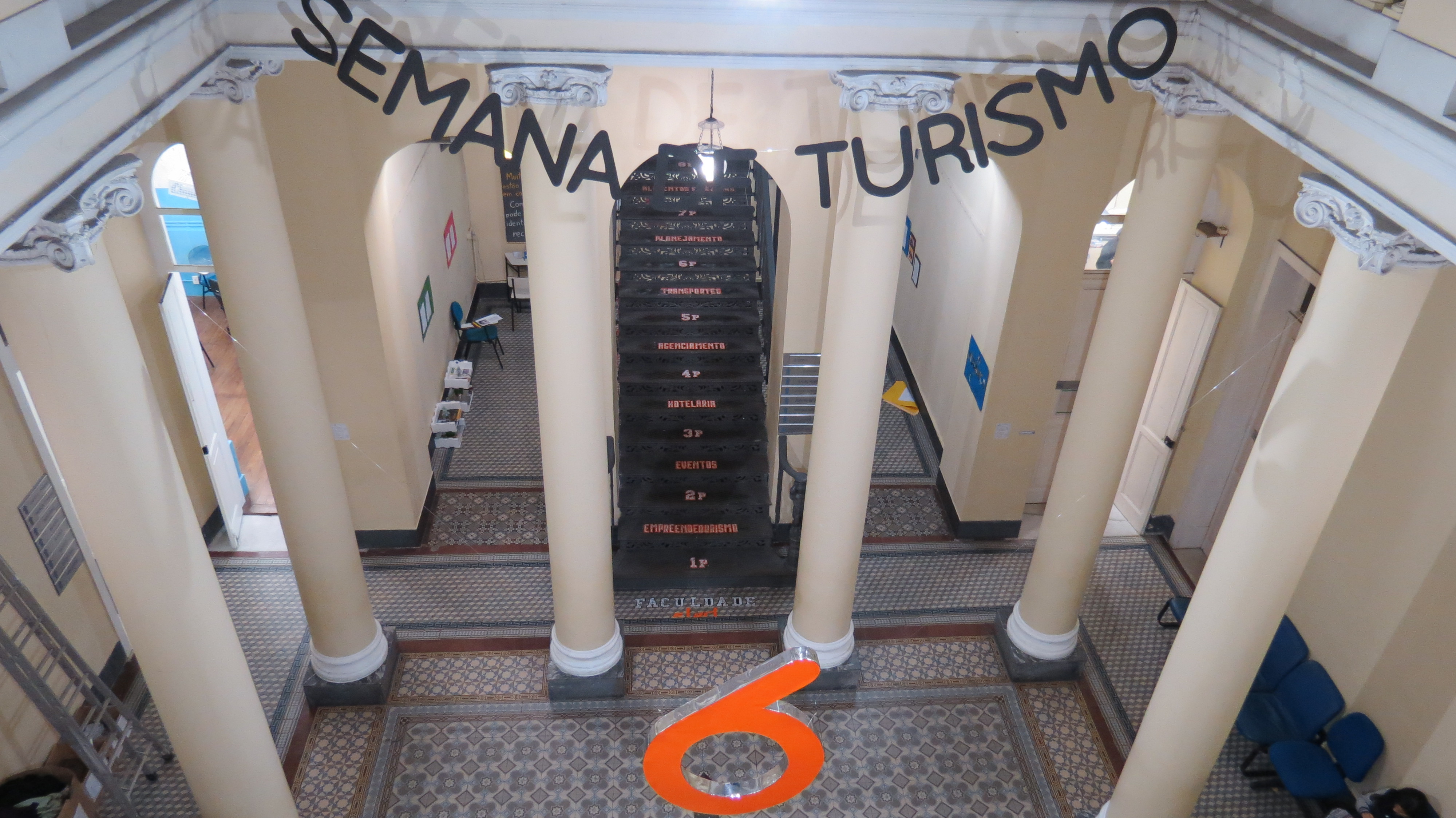 Saguão Principal do campus Petrópolis decorado para a 6ª Semana de Turismo.
