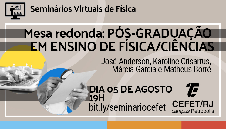 No próximo dia 5 de agosto, o projeto Seminários Virtuais realizará a “Mesa-redonda: pós-graduação em ensino de física/ciências” a partir da visão dos discentes egressos do curso de Licenciatura em Física do Cefet/RJ campus Petrópolis Karoline Crisarrus, José Anderson, Márcia Garcia e Matheus Borré.