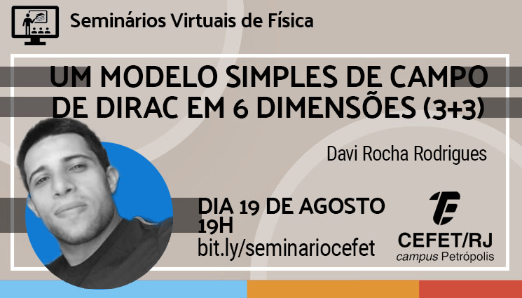 O Seminário Virtual de Física do dia 19 de agosto vai trazer como tema “Um modelo simples de campo de Dirac em 6 dimensões (3+3)” e será ministrado pelo ex-aluno de Licenciatura em Física do Cefet/RJ campus Petrópolis Davi Rocha Rodrigues. O encontro acontecerá a partir das 19h pelo serviço Conferência Web da RNP e será transmitido a partir do link bit.ly/seminariocefet.