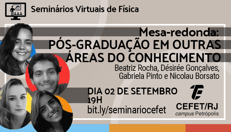 Alunos egressos do curso do Licenciatura em Física do Cefet/RJ campus Petrópolis vão promover no próximo encontro do Seminários Virtuais, no dia 2 de setembro, a “Mesa-redonda: pós-graduação em outras áreas do conhecimento”. Beatriz Rocha, Désirée Gonçalves, Gabriela Pinto e Nicolau Borsato vão discutir a temática a partir das seguintes questões: