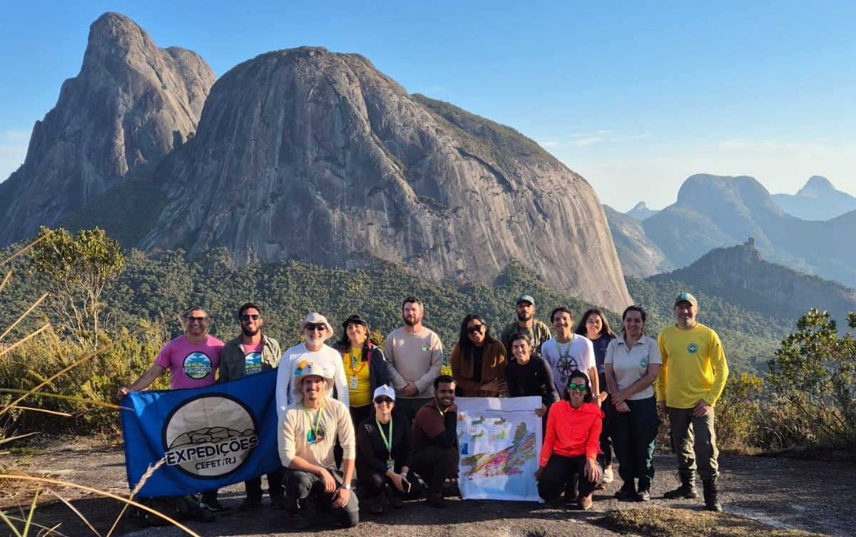 Participantes da atividade posam com o Maciço dos Três Picos e a Pedra do Capacete ao fundo.