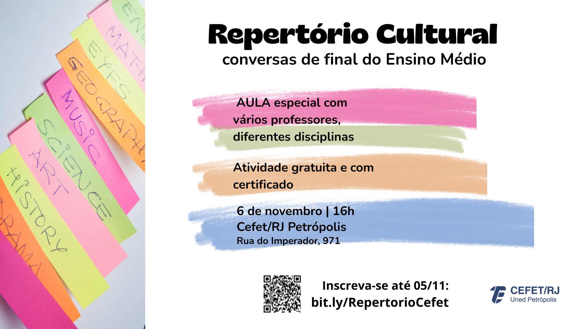 As inscrições para participar da aula estão abertas até o dia 5 de novembro pelo link https://bit.ly/RepertorioCefet. O Cefet/RJ Petrópolis emitirá certificado aos participantes.