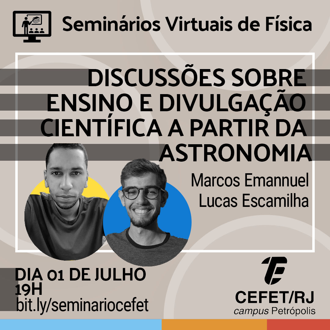 Na próxima quarta-feira, dia 17, será realizado o quinto encontro dos Seminários Virtuais de física. A apresentação, que abordará “A ciência nos anos finais do ensino fundamental:...