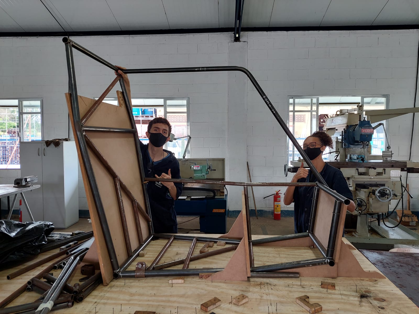 Figura 2 – Alunos construindo o protótipo no laboratório de processos de fabricação do Cefet/RJ campus Angra dos Reis - André Baral, do curso de Engenharia Elétrica, e Tuani Carvalho, do curso de Engenharia Mecânica.