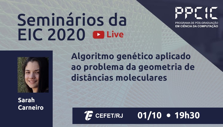Na próxima quinta-feira (01), o projeto Seminários da Escola de Informática e Computação (SEIC) realizará um encontro virtual com o tema “Algoritmo genético aplicado ao problema da geometria de distâncias moleculares”. A live inicia às 19h30 e será transmitida pelo canal do Programa de Pós-graduação em Ciência da Computação (PPCIC) do Cefet/RJ no YouTube.