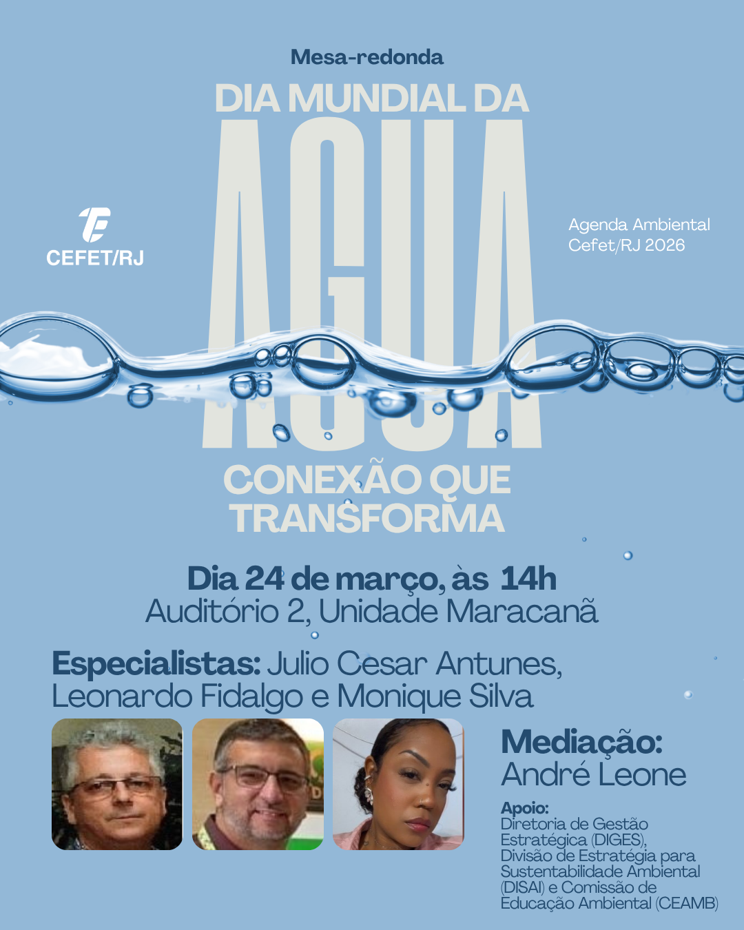 No dia 24 de março, às 14h, a Unidade Maracanã promoverá a mesa-redonda “Dia Mundial da Água: conexão que transforma”. A atividade, que acontecerá no Auditório 2, vai conectar os especialistas Julio Cesar Antunes, Leonardo Fidalgo e Monique Silva, sob a mediação do professor André Leone, para uma conversa sobre a importância da água. É necessário realizar inscrição prévia. Haverá entrega de certificado para os participantes.