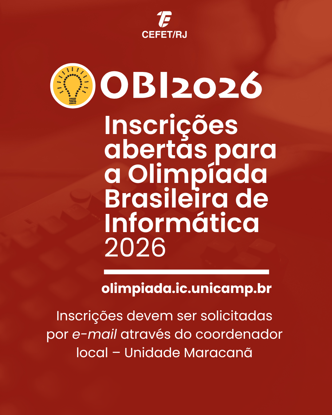 Para estudantes da Unidade Maracanã, as inscrições devem ser solicitadas, até o dia 5 de junho, através do coordenador local, professor João Quadros, do Colegiado do Curso de Graduação em Engenharia Eletrônica (CCGELT). Os interessados devem enviar e-mail para O endereço de e-mail address está sendo protegido de spambots. Você precisa ativar o JavaScript enabled para vê-lo. e colocar, no campo assunto, INSCRIÇÃO NA OBI 2026. Os dados para inscrição são: nome completo do estudante, telefone de contato, e-mail principal, CPF, turma, ano ou período, curso. Se o estudante tiver menos de 18 anos, deve incluir também, CPF, nome e telefone do responsável, assim como endereço completo (com CEP), data de nascimento e gênero.