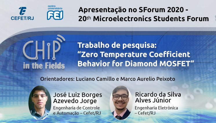 Os alunos do 8º período de Engenharia de Controle e Automação e Engenharia Eletrônica do Cefet/RJ, José Luiz Azevedo Jorge e Ricardo Alves Júnior, irão apresentar uma pesquisa sobre ponto invariante com a temperatura (do inglês, Zero Temperature Coefficient – ZTC) no evento internacional Chip in the Fields. O trabalho de pesquisa, intitulado “Zero Temperature Coefficient Behavior for Diamond MOSFET”, será apresentado no dia 27 de agosto, em uma das cinco conferências on-line do evento, dedicada a estudantes de microeletrônica.