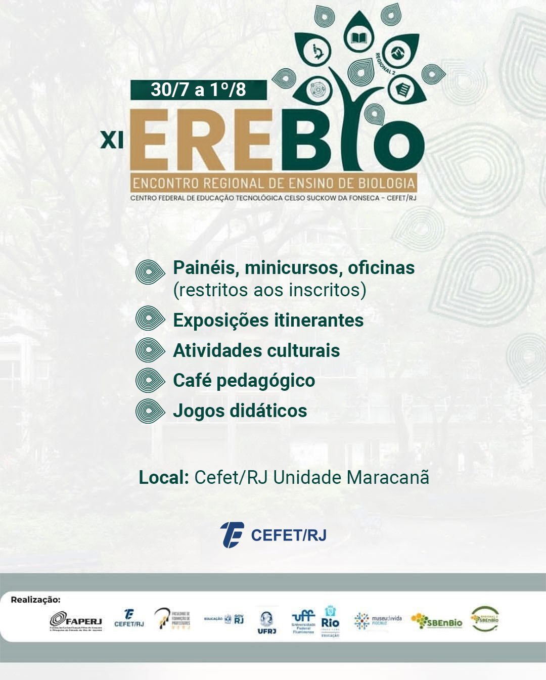 Entre os dias 30 de julho e 1º de agosto, o Cefet/RJ Unidade Maracanã será palco do XI Encontro Regional de Ensino de Biologia (EREBIO), organizado pela Associação Brasileira de Ensino de Biologia (SBEnBio). Com uma programação diversificada, o evento contará com atividades científicas e culturais abertas ao público, como exposições itinerantes, café pedagógico e jogos didáticos.