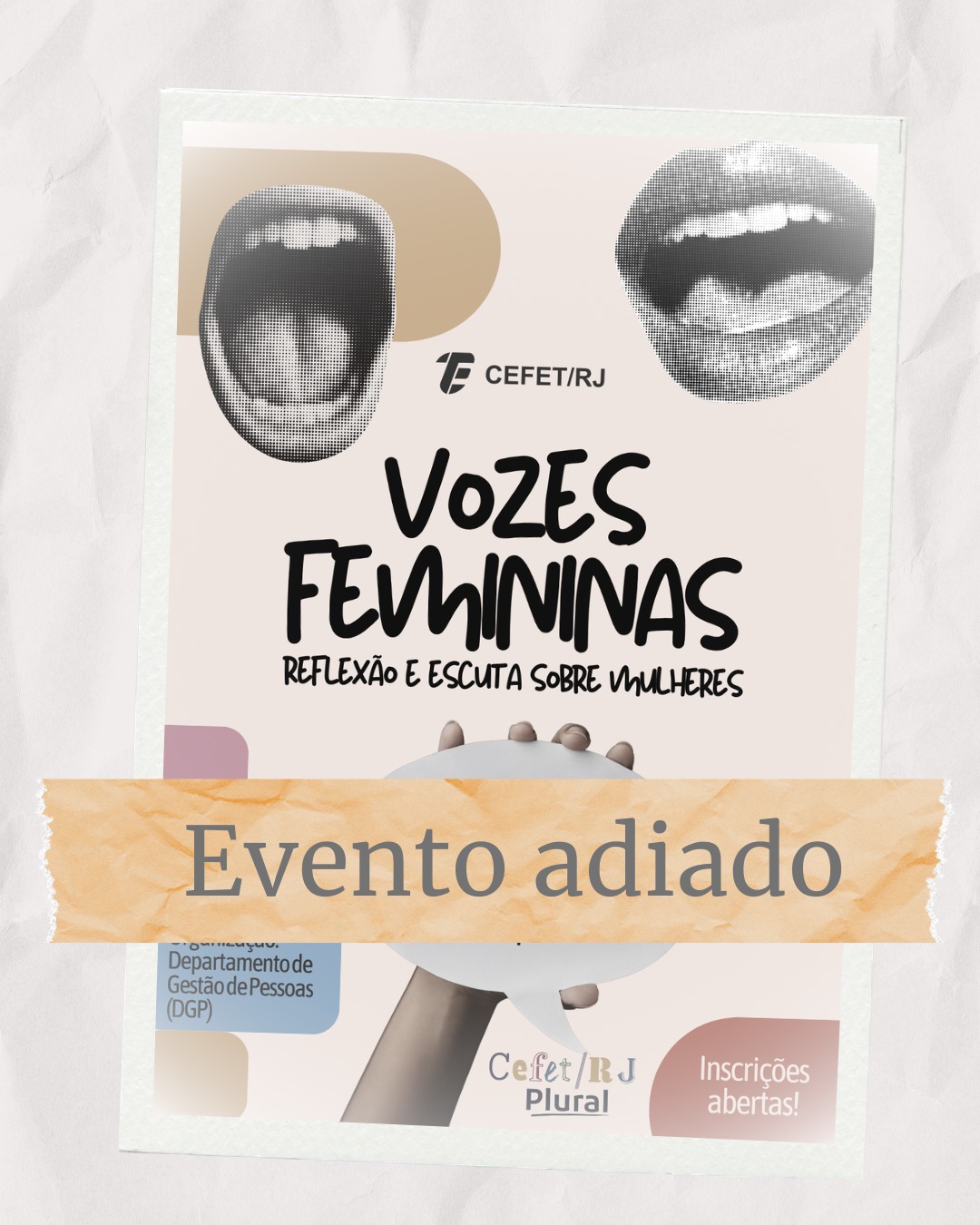 O Departamento de Gestão de Pessoas (DGP) do Cefet/RJ informa que o evento “Vozes Femininas: reflexão e escuta sobre mulheres”, previsto para os dias 24 e 25 de março de 2026, foi adiado, com nova data a ser divulgada posteriormente.