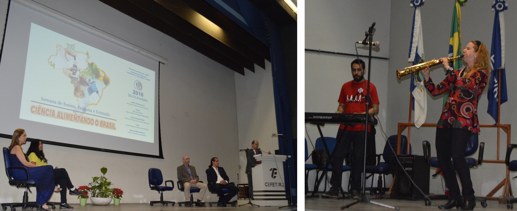 Os professores de Música do Cefet/RJ, Daniela Spielmann e Oliver Bastos, enceraram a solenidade de abertura da SEPEX 2016, tocando diversos clássicos da MPB e da Bossa Nova, em um show instrumental no Auditório 1 do campus Maracanã.