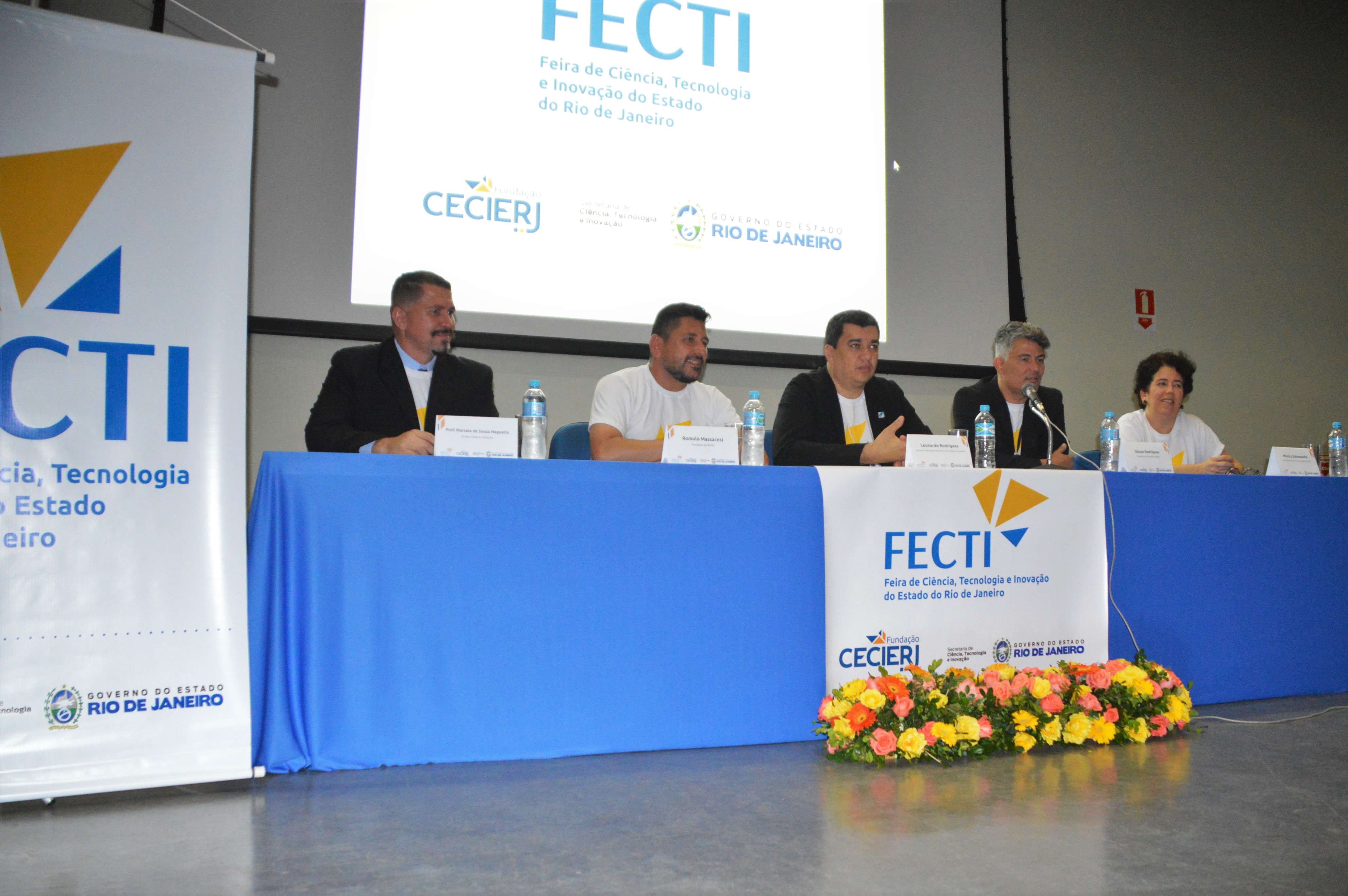 A cerimônia de abertura da FECTI foi realizada no Auditório 1 e teve a participação do secretário de Ciência, Tecnologia e Inovação, Leonardo Rodrigues; do presidente da Fundação Cecierj, Gilson Rodrigues; do presidente da Faetec, Romulo Massacesi; do diretor-geral pro tempore do Cefet/RJ, Marcelo Nogueira; e da vice-presidente científica da Fundação Cecierj, Monica Dahmouche.