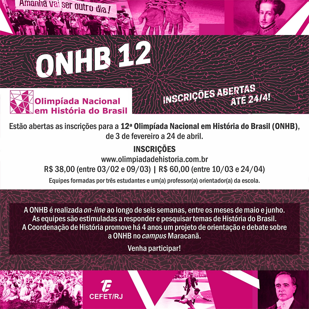 Estão abertas as inscrições para a 12ª edição da Olimpíada Nacional em História do Brasil (ONHB). Estudantes dos cursos de nível médio/técnico do Cefet/RJ podem se inscrever até 24 de abril, mas, de acordo com o cronograma, é possível garantir um desconto na taxa de inscrição cadastrando-se até o dia 9 de março. As provas começam no dia 4 de maio e a etapa final ocorre nos dias 15 e 16 de agosto.
