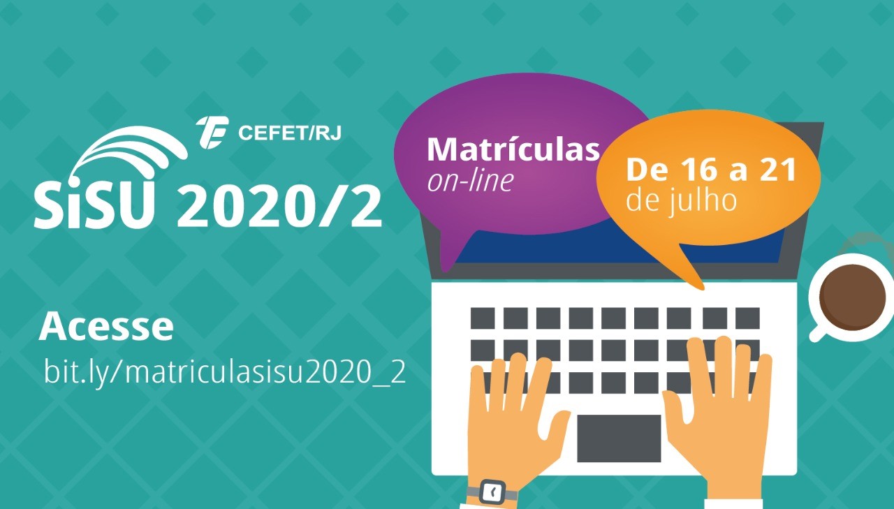 A Coordenadoria de Concursos (CCONC) informa que, diante da situação excepcional de pandemia e da consequente necessidade de manutenção da segurança e da higiene, a matrícula nos cursos de graduação do Cefet/RJ, referente à chamada regular do Sisu para o 2º semestre letivo de 2020, será on-line, e ocorrerá, impreterivelmente, no período de 16 a 21 de julho de 2020.