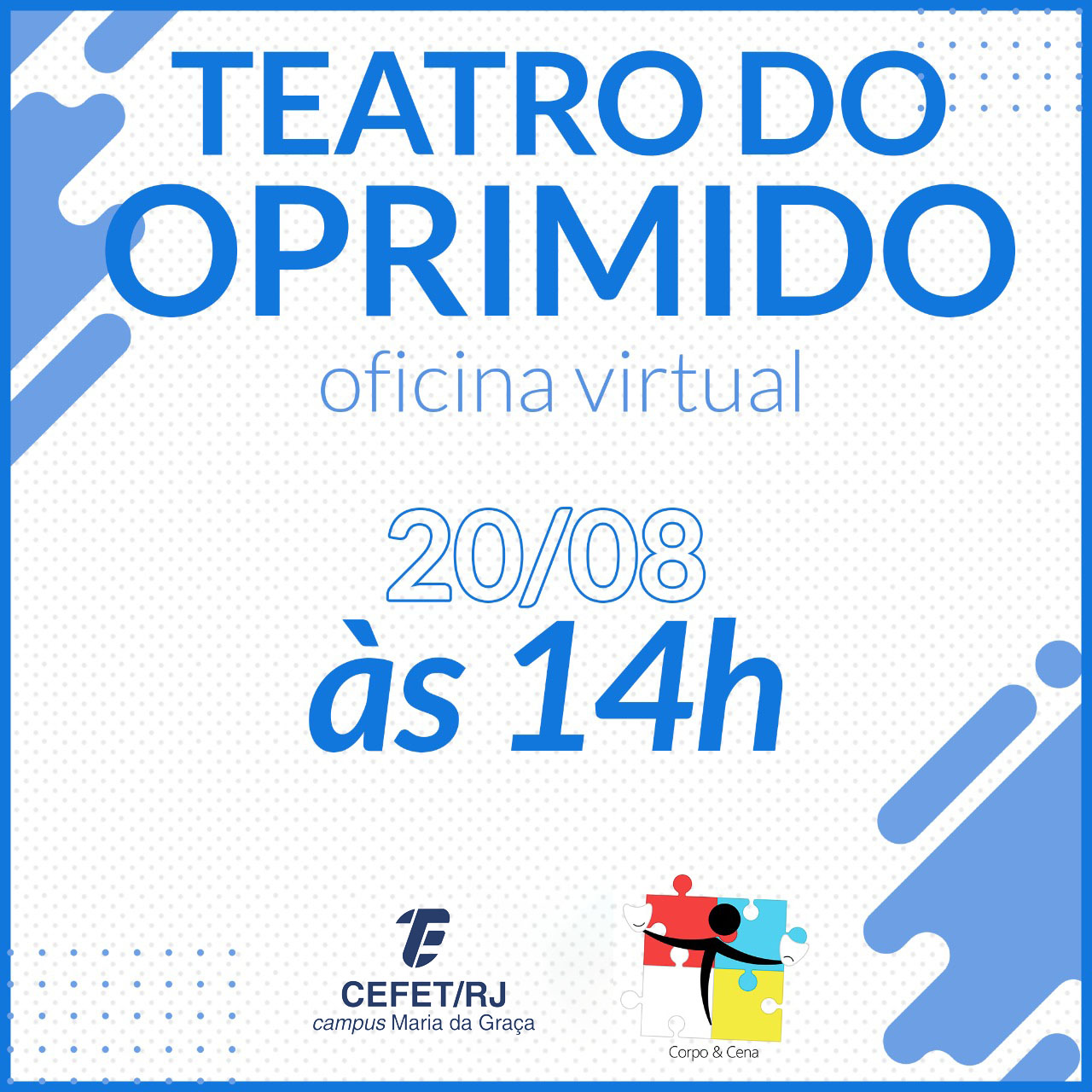 O projeto de extensão “Diálogos entre escolas”, do campus Maria da Graça, e o grupo Corpo & Cena realizam, no dia 20 de agosto de 2020, das 14h às 16h, a oficina de Teatro do Oprimido, com objetivo de apresentar uma introdução ao trabalho iniciado por Augusto Boal, diretor de teatro, dramaturgo e ensaísta brasileiro, uma das grandes figuras do teatro contemporâneo internacional, falecido em 2009, e perpetuado por diferentes grupos de todo o mundo.